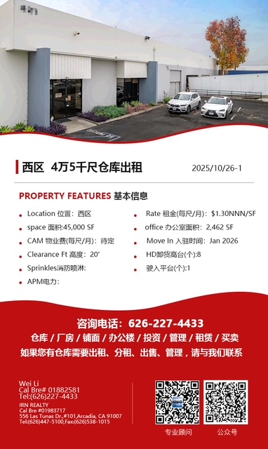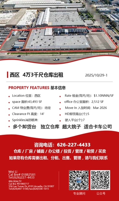 【仓库出租】Wei Li专业商业地产团队提供,10月23日,5万尺以下洛杉矶仓库出租更新,电话 626-227-4433,官网 www.51warehouse.com
