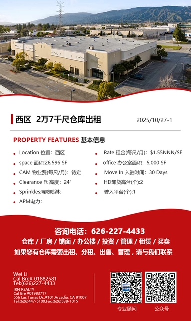 【仓库出租】Wei Li专业商业地产团队提供,9月25日,5万尺以下洛杉矶仓库出租更新,电话 626-227-4433,官网 www.51warehouse.com