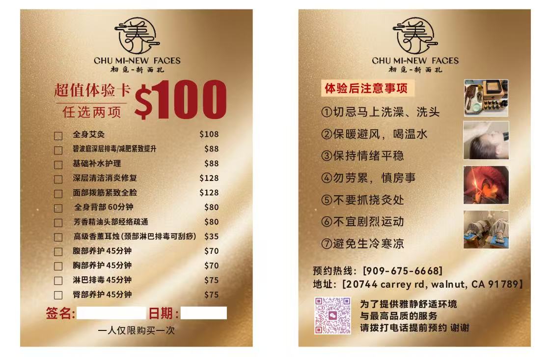 初覓CHU MI-NEW FACES是坐落在核桃市的健康美容馆,环境优雅,舒适。是为您提供高品质服务的养生馆,雅静舒适的环境,专业、亲切、友善的服务让您在轻松愉快中舒缓压力、助眠好眠。中醫文化。中藥熏蒸,古方艾灸仓理念,千年古法重启您身体年轻秘密。碧波庭理念,内在负压养生仪,波动吸放。芳香耳烛疗法理念,减轻头耳沉重感,深度放松带来轻松舒适。您要有品质的生活吗?请来初覓CHU MI-NEW FACES一沉浸式時光護理一放鬆肌膚 愉悦身心。新张有优惠,预约请电:9096756668