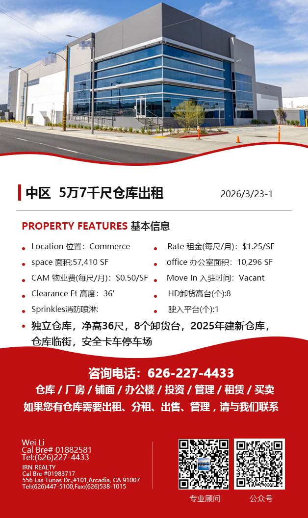 【仓库出租】Wei Li专业商业地产团队提供,2月26日,洛杉矶仓库出租更新,电话 626-227-4433,官网 www.51warehouse.com