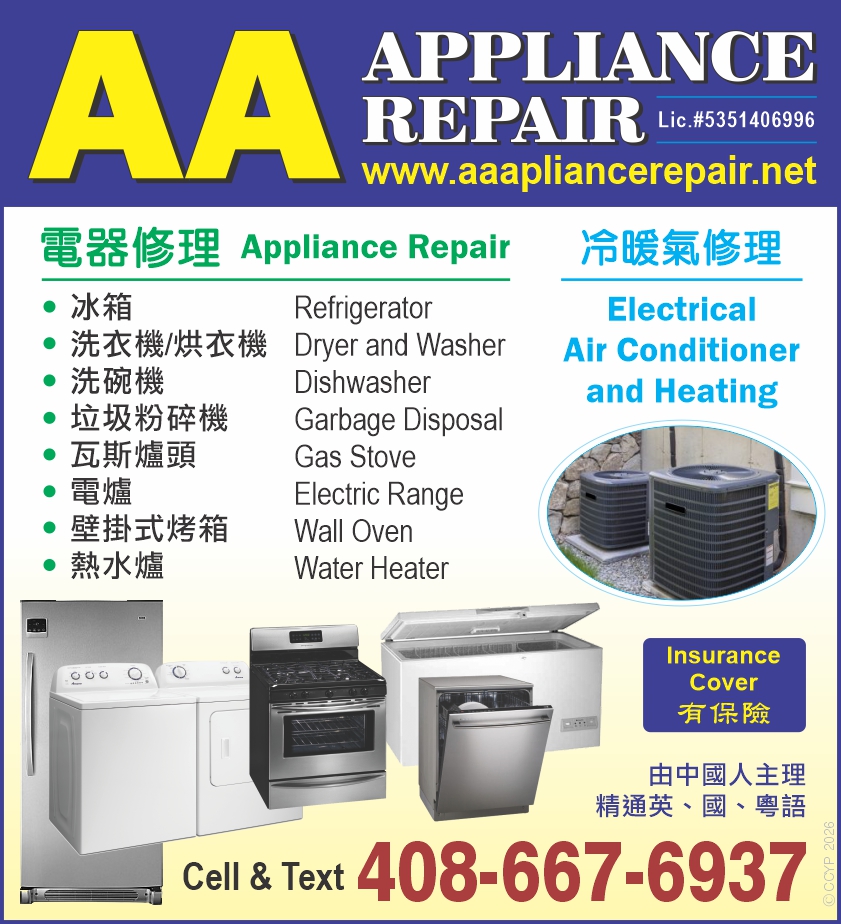 AA家用电器修理 (AA APPLIANCE REPAIR) 拥有最专业的电器维修团队,服务全湾区华人社区多年, 提供你满意而且专业的维修,只要您府上: