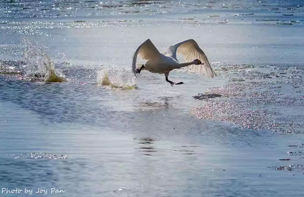 第一次看见天鹅,是十年前在英国皇家建筑的一个后花园里。后来又在瑞士苏黎世、卢塞恩一带湖里见过,以为是人工养殖的,其实那些天鹅都是野生的,可能也是西伯利亚飞来越冬的。现在在祖国的胶东半岛,能近距离接触天鹅、拍摄天鹅穿日越海,在薄冰的湖面降落滑行,观赏候鸟们的天生智慧,别有一番情趣。