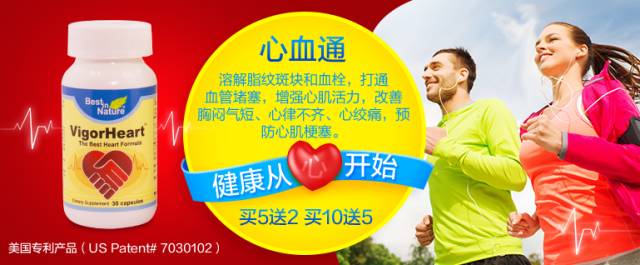 美国专利产品【心血通VigorHeart】(专利号US Patent #9561272,#9017697)由美国心脏学会Sinatra医学博士强力推荐,所含CoQ10、Salvia、Notoginseng是心脏健康最佳营养源。