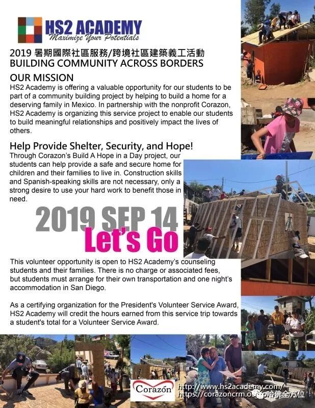 参加义工项目的学生们将前往Chula Vista(美墨边境附近),并在酒店度过周五晚上。周六上午,大家在购物中心的停车场集合,然后一起穿越美墨边境。