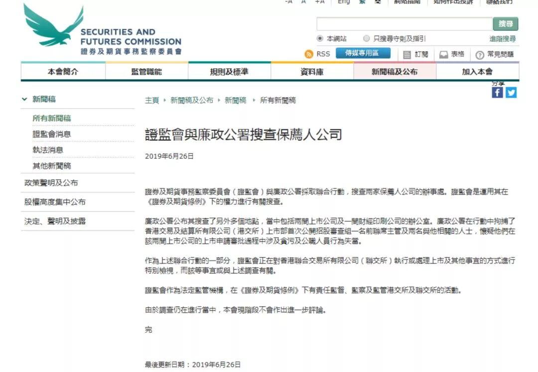 6月26日,香港证监会发布公告称,证监会与廉政公署采取联合行动,搜查两家保荐人公司的办事处、两间上市公司及一间财经印刷公司的办公室。廉政公署在行动中拘捕了港交所上市部首次公开招股审查组一名前联席主管及两名与他相关的人士,怀疑他们在该两间上市公司的上市申请审批过程中涉及贪污及公职人员行为失当。