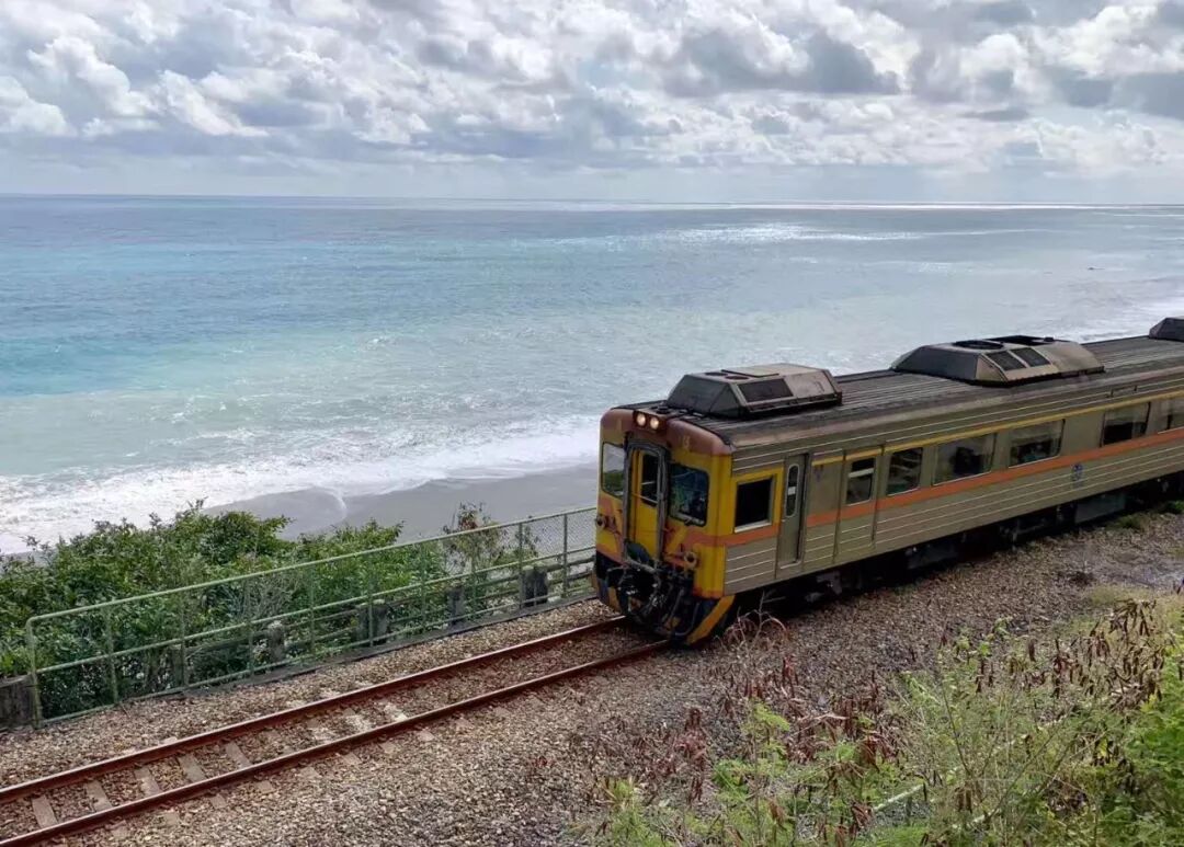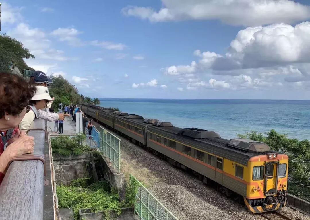 台湾最美的多良火车站。这是濒海的一个小小车站,气喘吁吁地登临半山腰的月台,可鸟瞰湛蓝的太平洋。翘首以待,不久就有一列火车鸣着长笛,呼啸而过,拍了个正着,巧极了!