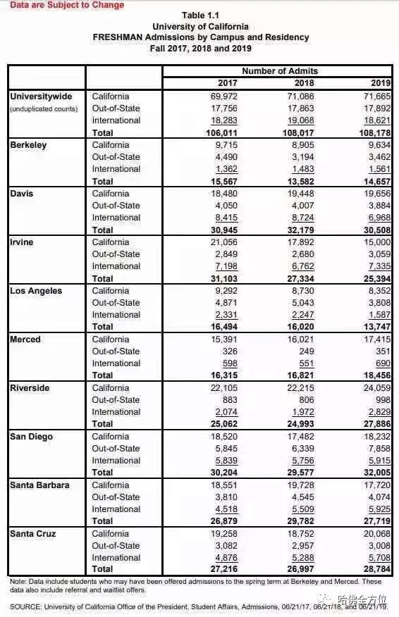 UCD 加大戴維斯分校, UCSB 加州大學聖塔芭芭拉分校以及UCI 加州大學爾灣分校都各少錄取了2千人左右。其中UCD 加大戴維斯錄取的外籍/外州的錄取學生數字大幅降低。