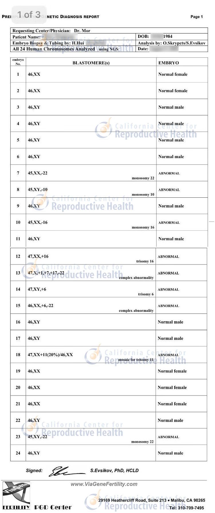 两周以后,W的囊胚有15颗通过PGT(全染色体筛查),其中10颗男宝宝,5颗女宝宝。