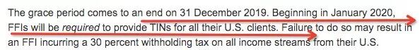从2019年12月31日开始,美国国税局IRS,将最终结束其长期运行的《海外账户纳税法案》(FATCA“肥咖”条款)宽限期。