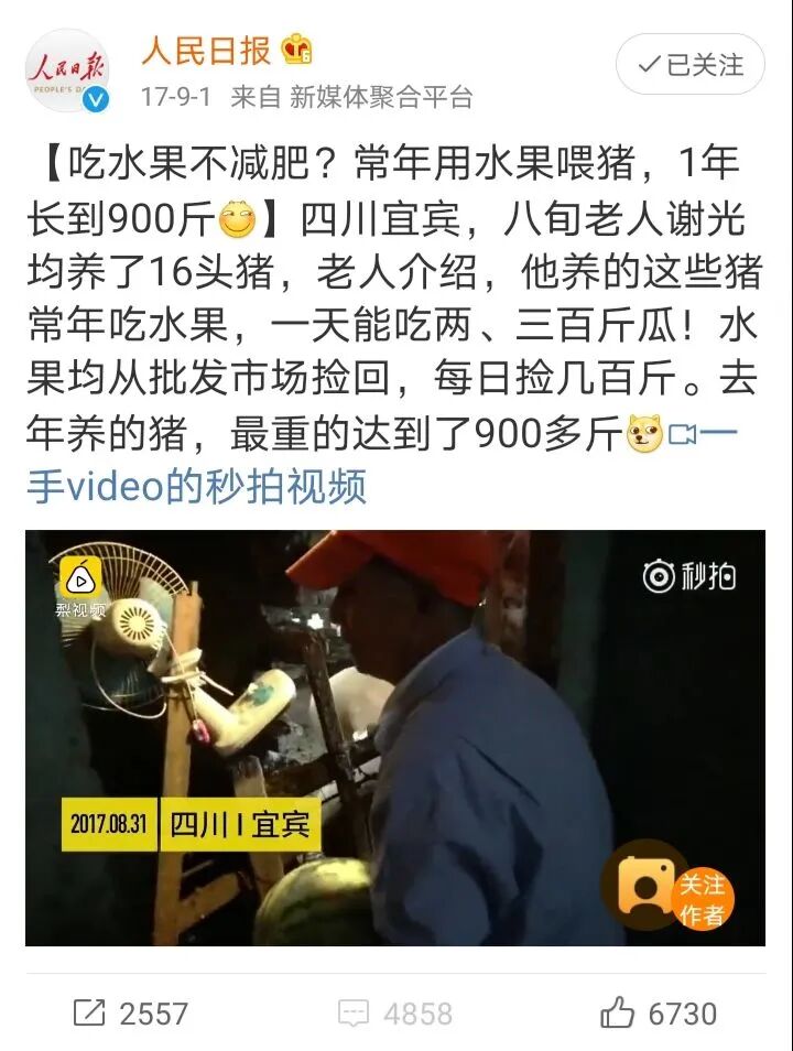 水果营养丰富又不含脂肪,因此,很多人吃起水果就没有节制。但是,这并不是健康的做法,因为,大部分水果的膳食纤维和糖分含量较高,吃太多会引起胃痛、腹胀,还会让血糖增高。没错,这是一个真实的新闻,甚至还上过微博“热搜”。虽然,后来有人解释:由于人和猪的消化系统功能不同,猪能靠吃水果“快速上膘”,人吃水果并不能达到这种“增肥”效果。但是,英国《每日邮报》也曾指出:靠水果减肥不是一个好方法,它会让你越吃越饿!