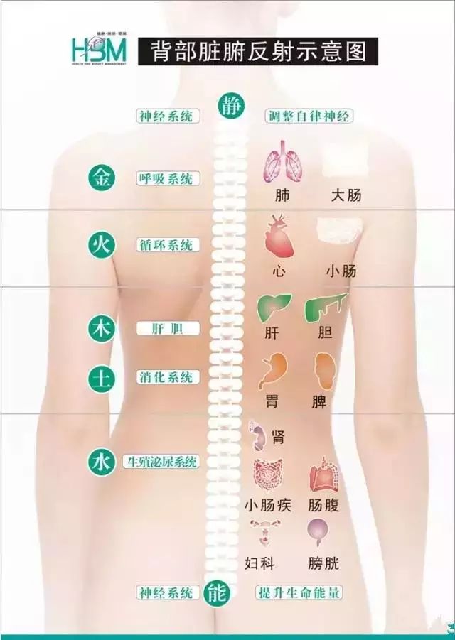 后背的保养背部是以脊椎为中心的整个人体的全息缩影,人体的五脏六腑均可在背部找到相应的对应区。如背上部对应肺和心脏,背下部对应脾、胃、肝、胆,腰部对应肾、膀胱、大肠和小肠。