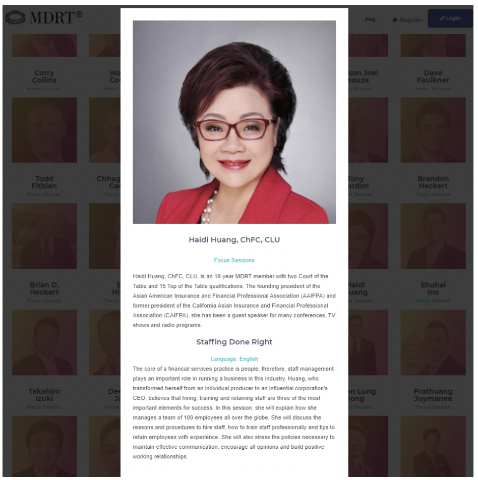 2018 -2020美国奥淇金融/美国宏盛保险与理财作为美国本土唯一的大会赞助商和MDRT的全球战略合作伙伴,与来自全球各地的保险理财精英们在线上进行交流和互动。奥淇/宏盛总裁兼CEO黄海蒂女士作为大会的Speaker 之一,与大家分享她从事寿险行业30年来的经验。美国奥淇/宏盛总裁兼CEO黄海蒂女士作为speaker跟大家分享《Staffing Done Right》