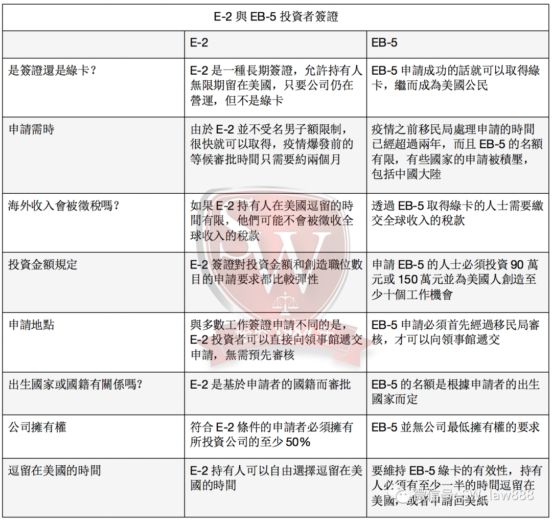 近年很多中国大陆的投资者都倾向申请E-2签证来美,E-2不受名额限制,反而EB-5绿卡申请要排队,走过整个程序随时要花上十年,下图比较了两款签证之间的主要分别﹕