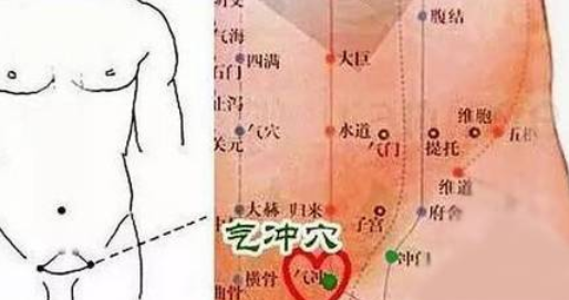 气冲穴在人体腹股沟处,大腿根儿内侧,具有治疗月经不调、不孕、痛经、双脚冰凉的作用。