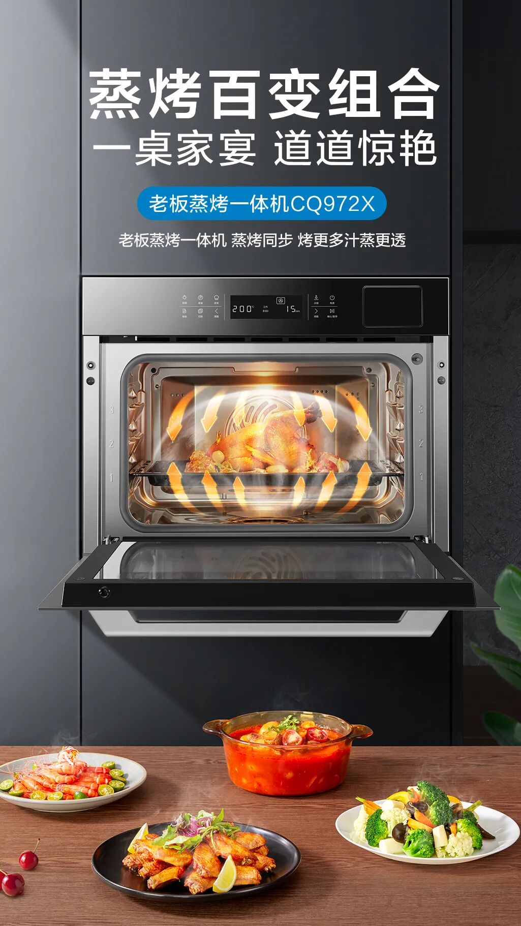 就让老板蒸烤一体机CQ972X来满足板栗们对美食和烹饪的高标准和高要求,助力我们真正实现一桌家宴道道惊艳的无忧厨房生活!