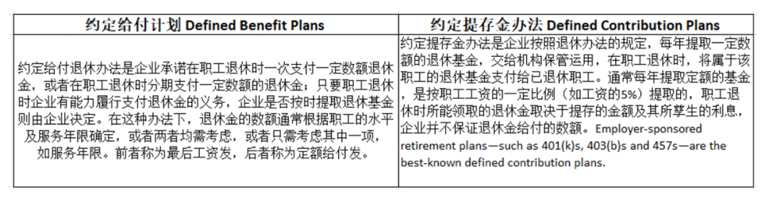 根据是否满足ERISA – 雇员退休收入保障法,分为Nonqualified plan 和 qualified plan,二者有以下的区分:Qualified Plan 又分为两种:约定给付计划(Defied Benefit Plans)和约定提存金办法(Defined Contribution Plans)。区别如下图: