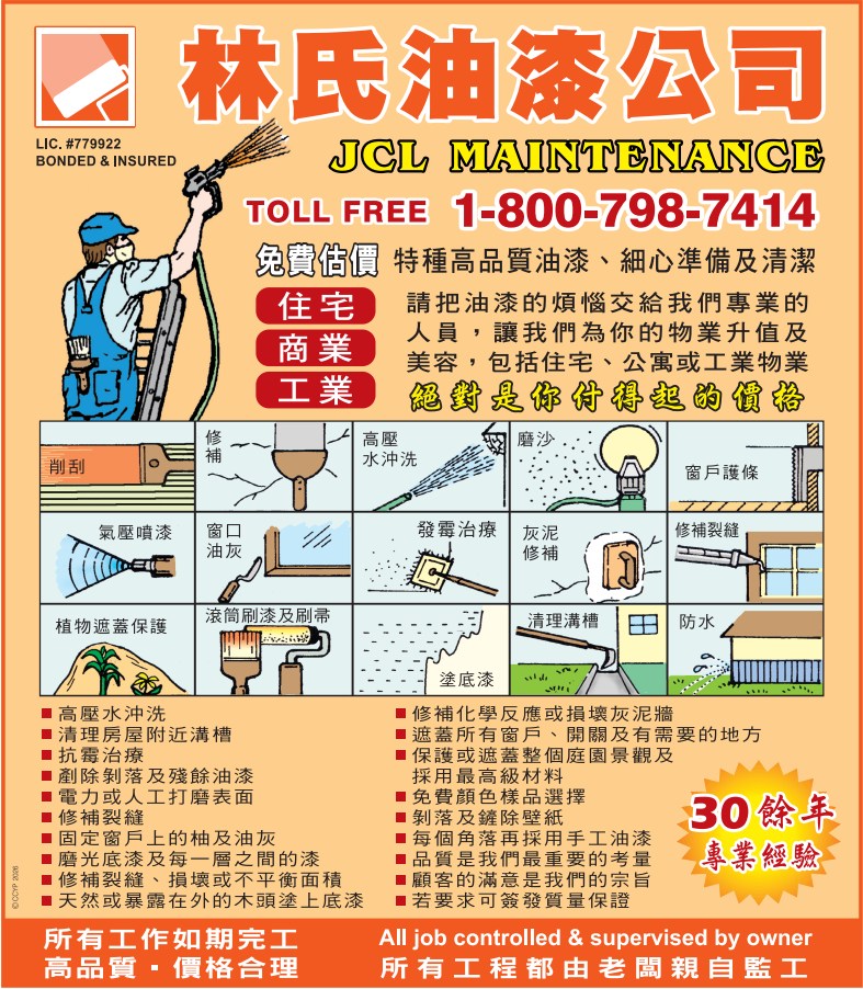 加州執照 License #946167 (C33, B),200萬責任險,100萬勞工險。25年經驗,精通中文,韓文,英文。價格合理,免費估價,誠信負責。
