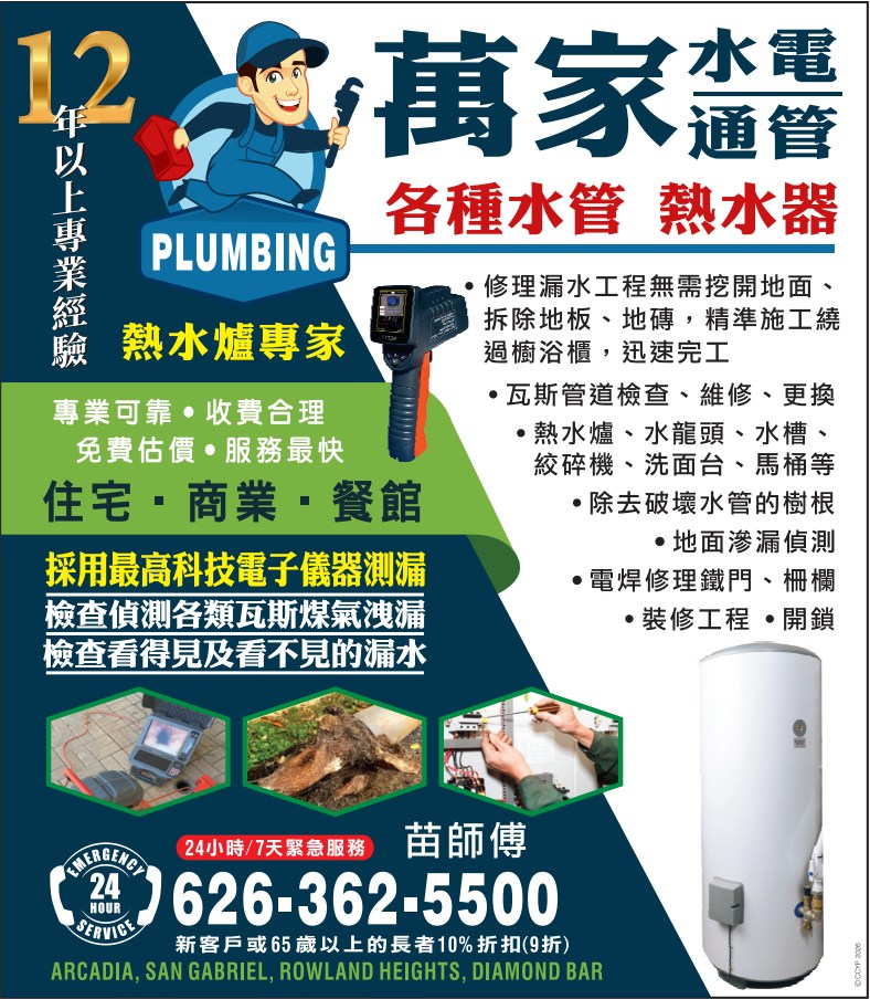 萬家維修專家苗師傅,多年來服務鄰近華人居住地區, 一切為客戶著想。認真、負責的為客戶解決一切疑難雜症。超過十年以上的專業工作經驗及良好的口碑,取得了客戶的信賴。萬家水電通管專精熱水爐並採用最新科技儀器測漏。解決地下漏水、排水管阻塞等疑難雜症。